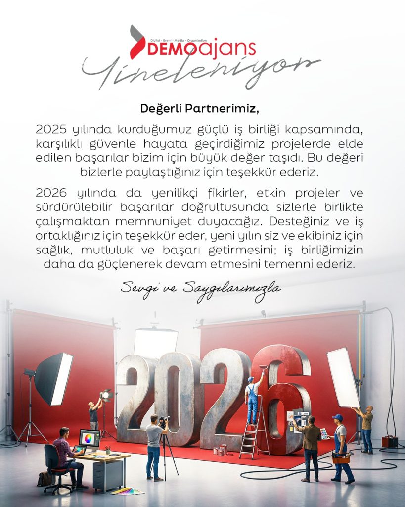 Dijital, Etkinlik, Medya ve Organizasyon alanında sektörün önde gelen isimlerinden Demo Ajans, yeni yıl vesilesiyle değerli iş ortaklarına ve kamuoyuna özel bir mesaj yayınladı. Mesajda, geride bırakılan 2025 yılının değerlendirmesi yapılırken, 2026 yılına dair yenilikçi fikirler, aktif projeler ve sürdürülebilir başarı hedefleri vurgulandı.